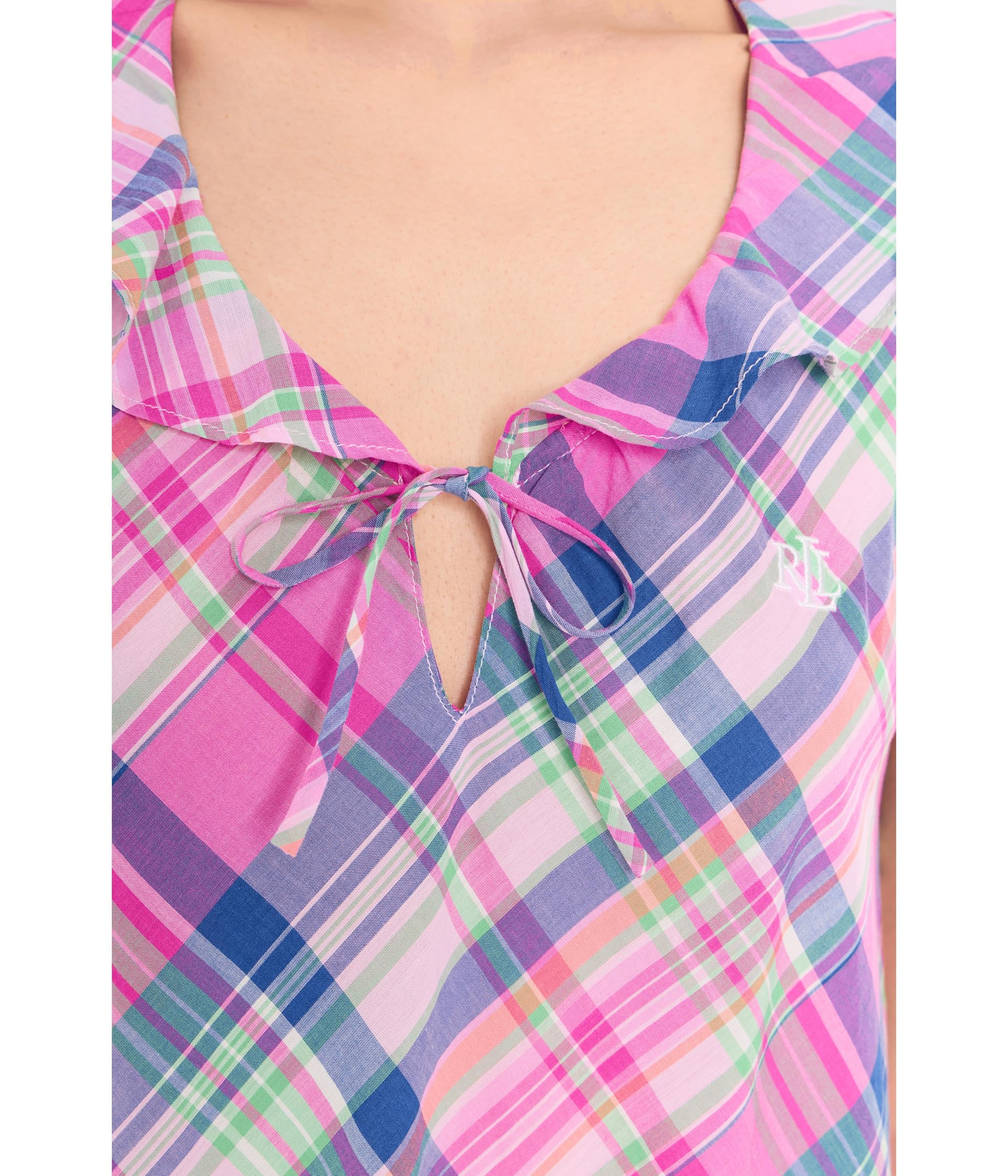 This sleeveless nightgown features a soft pink plaid pattern accented with blue and white lines for a fresh, charming look. The neckline is finished with delicate ruffle trim and a small front bow detail, adding a sweet and feminine touch. Designed with a relaxed A-line silhouette, this sleep dress drapes comfortably over the body and finishes with a flounce hem that gives it a light, playful feel.