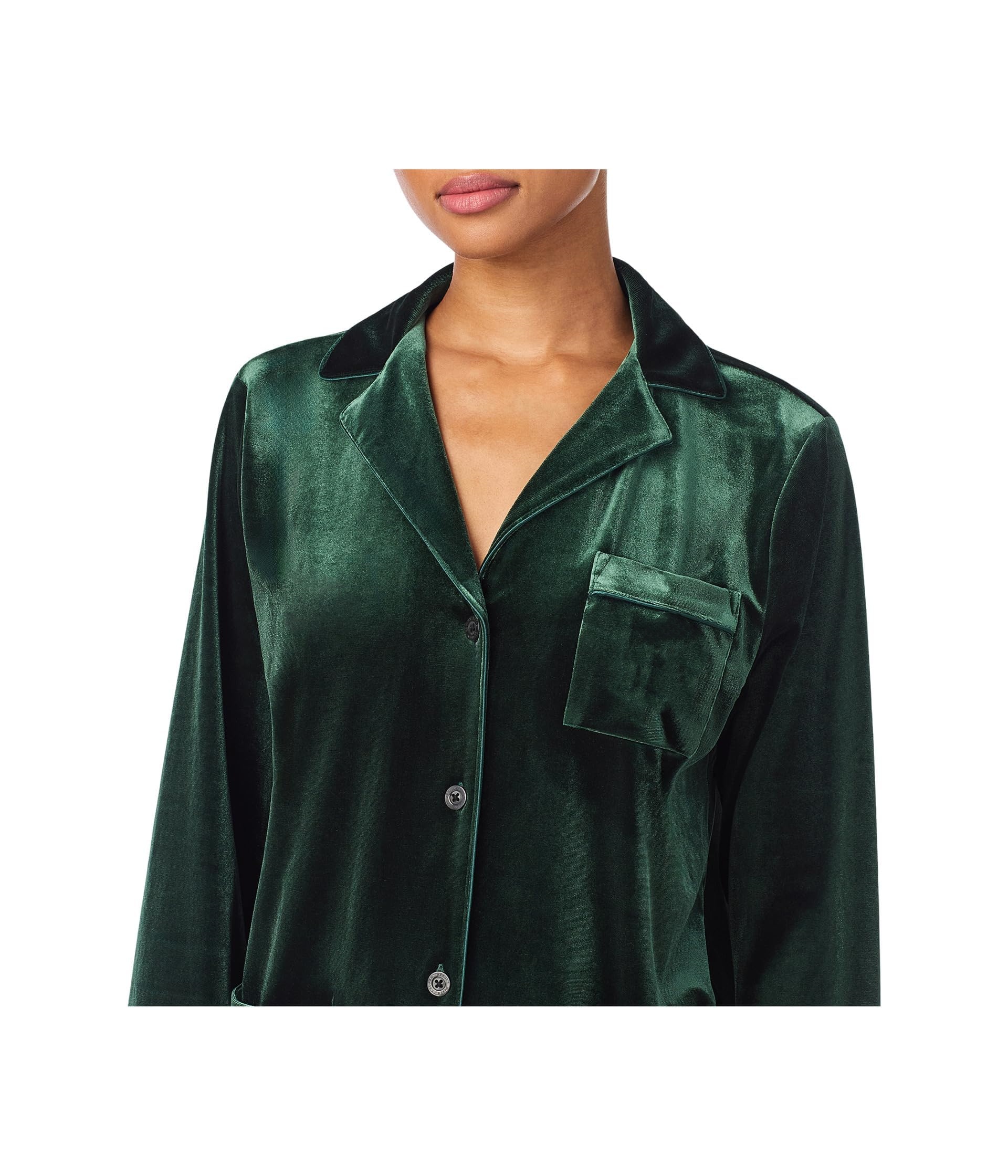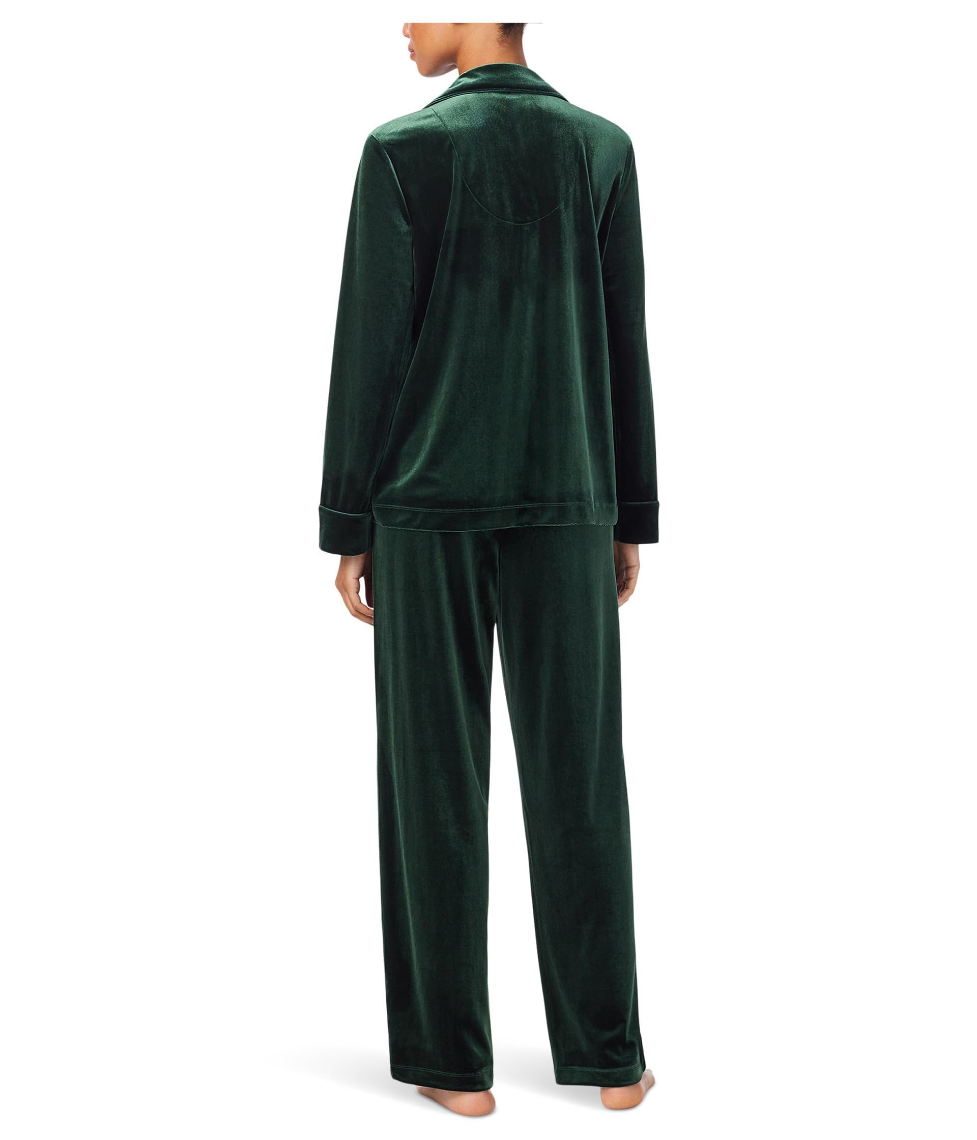 This pajama set features a rich dark green color and a smooth velvet-look finish that gives it an elegant, luxurious appearance. The long sleeve top is designed with a classic notched collar, button-front closure, chest pocket, and front patch pockets, creating a timeless sleepwear style that feels polished yet relaxed. The matching pants are cut with a fluid wide-leg silhouette for a comfortable fit and graceful drape.