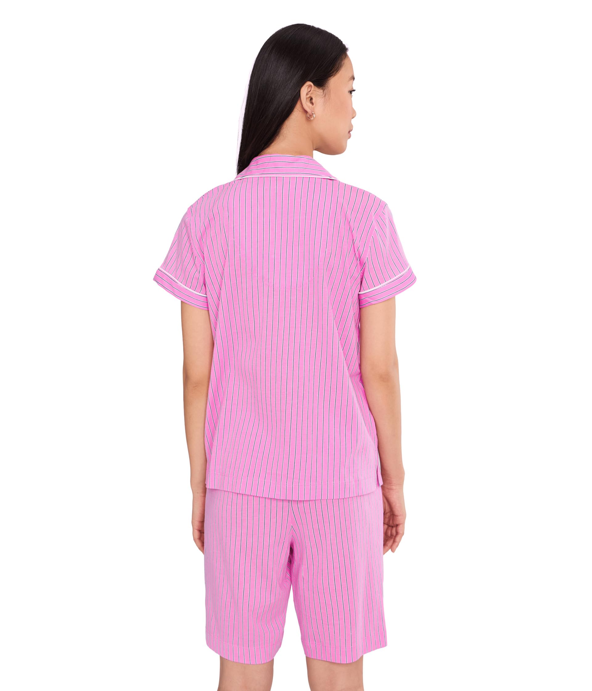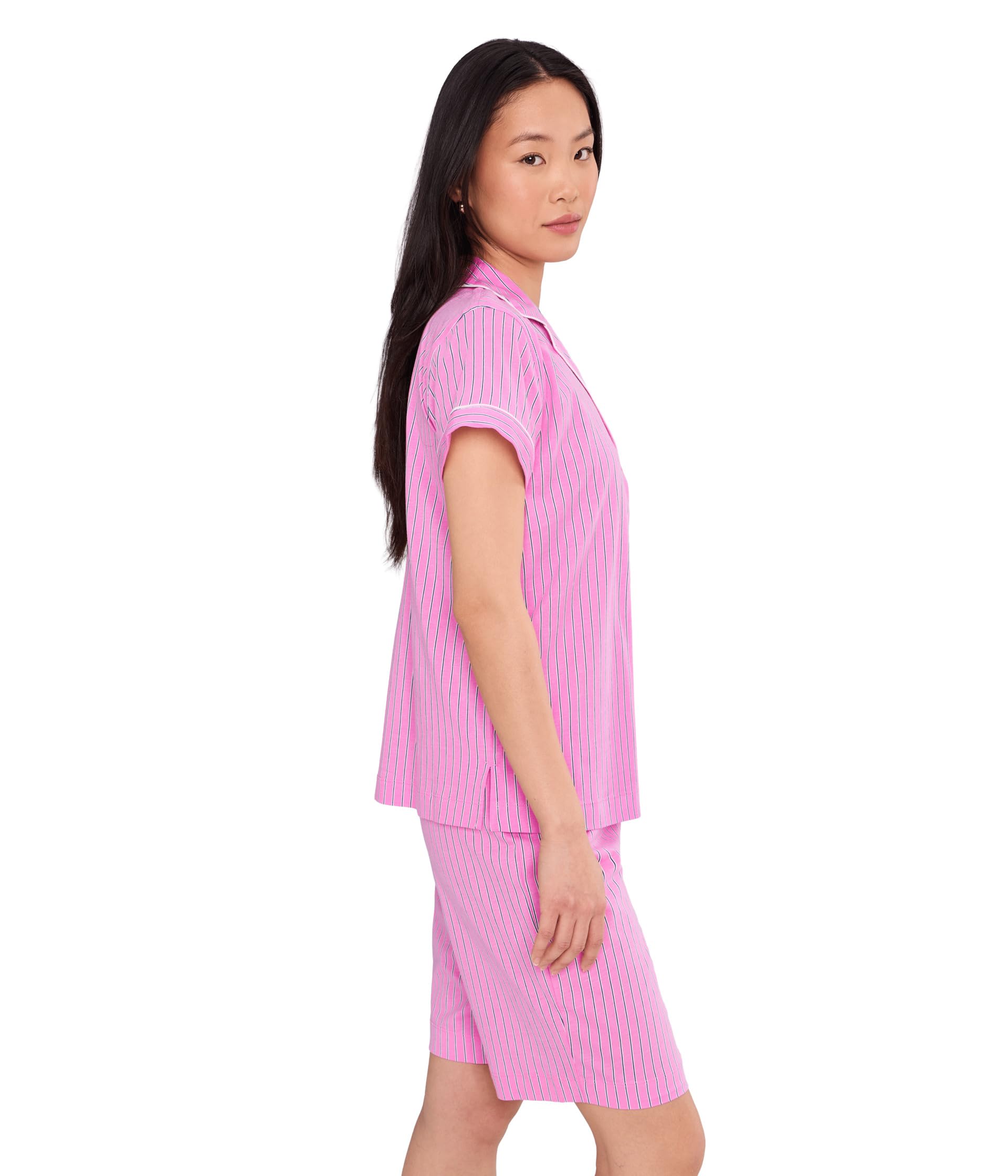 This pajama set features a bright pink base with fine vertical stripe detailing for a fresh and playful sleepwear look. The short sleeve top is designed with a classic notched collar, button-front closure, contrast piping, and a small embroidered chest detail, giving it a polished pajama-inspired finish. The matching shorts are cut in a relaxed Bermuda length for comfortable coverage and easy movement.