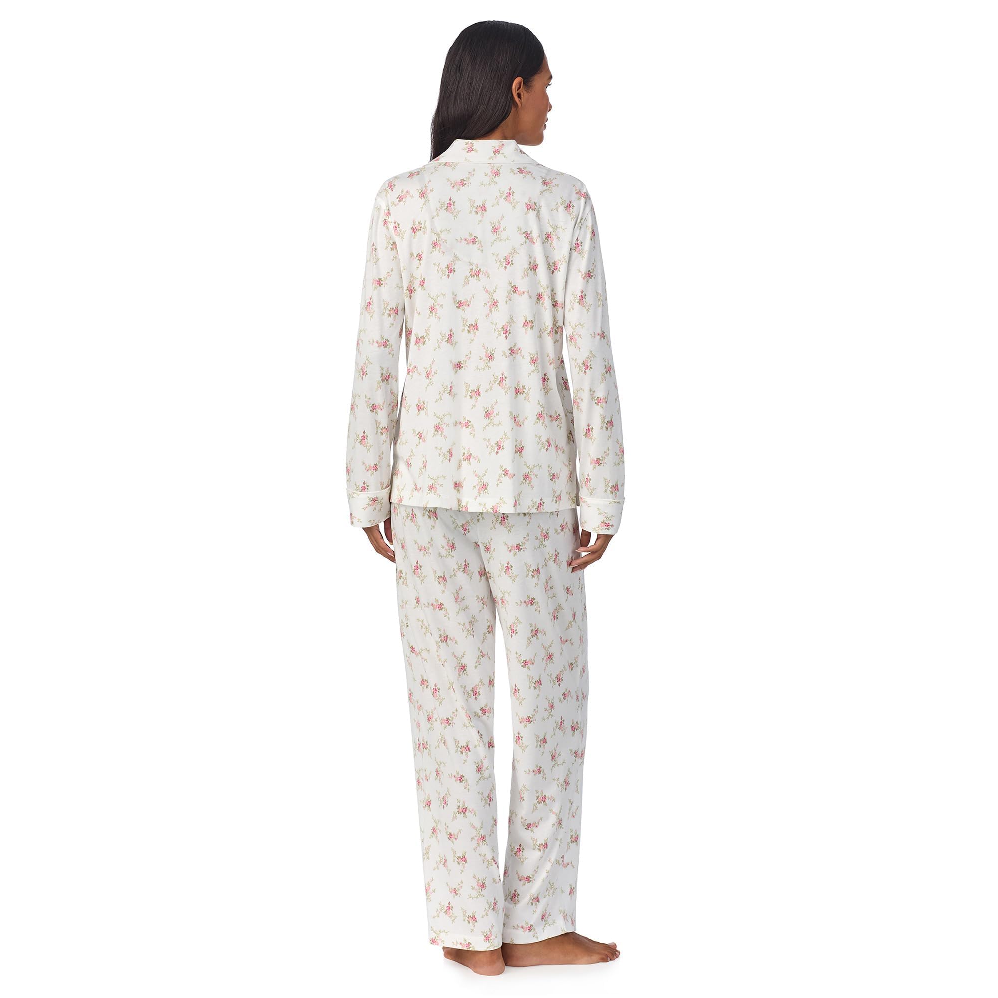 This pajama set features a soft ivory base decorated with a delicate allover floral print in blush pink and muted green tones, creating a sweet and timeless sleepwear look. The long sleeve top is styled with a classic notched collar, button-front closure, and a relaxed silhouette that feels polished while remaining comfortable for everyday wear. The matching full-length pants complete the set with an easy straight-leg shape that works well for sleeping, lounging, and quiet mornings at home.