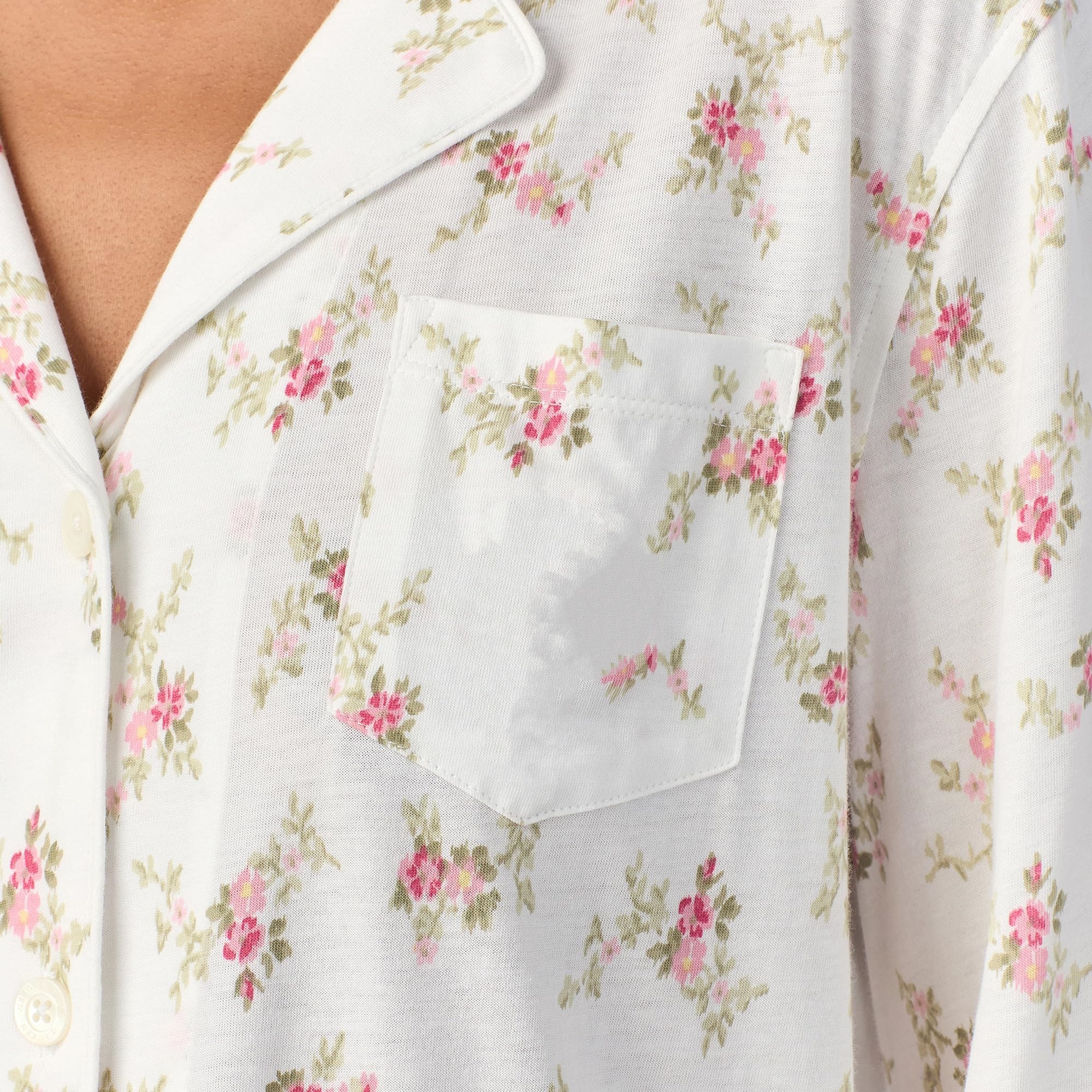 \nMade from 60% Cotton, 40% Viscose, the fabric offers a breathable, soft touch with a smooth, lightweight drape for lasting comfort. The cotton helps keep the set airy and gentle against the skin, while the viscose adds a fluid feel that enhances the graceful look of the floral pattern. Feminine, classic, and easy to wear, this matching pajama set is a lovely choice for bedtime, weekend lounging, travel, or gifting.