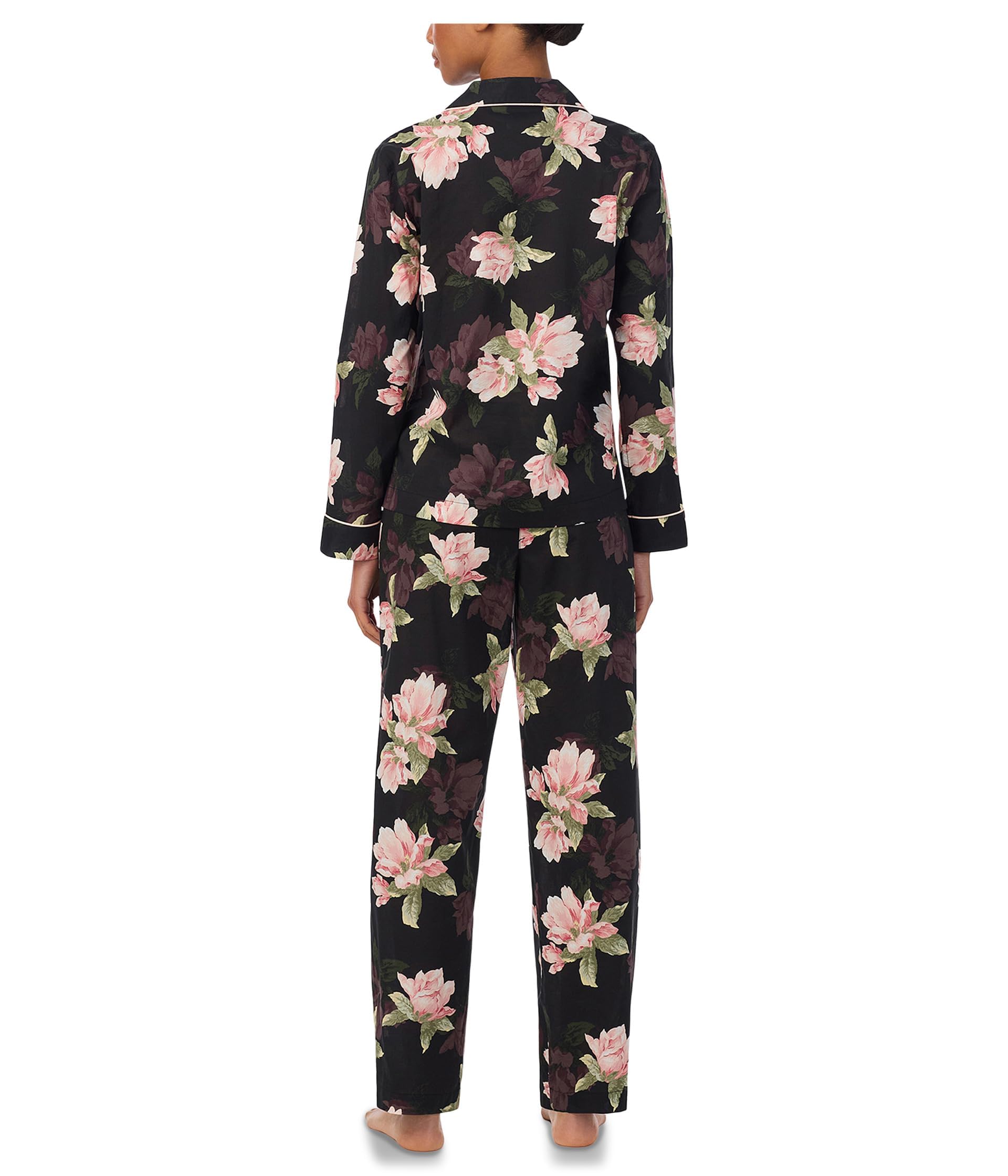 This pajama set features a rich black base with an allover large-scale floral print in soft pink, ivory, and muted green tones for an elegant and romantic sleepwear look. The long sleeve top is designed with a classic notched collar, button-front closure, contrast piping, and a relaxed silhouette that feels polished yet comfortable. The matching full-length pants complete the set with an easy straight-leg shape for comfortable movement and a coordinated finish.