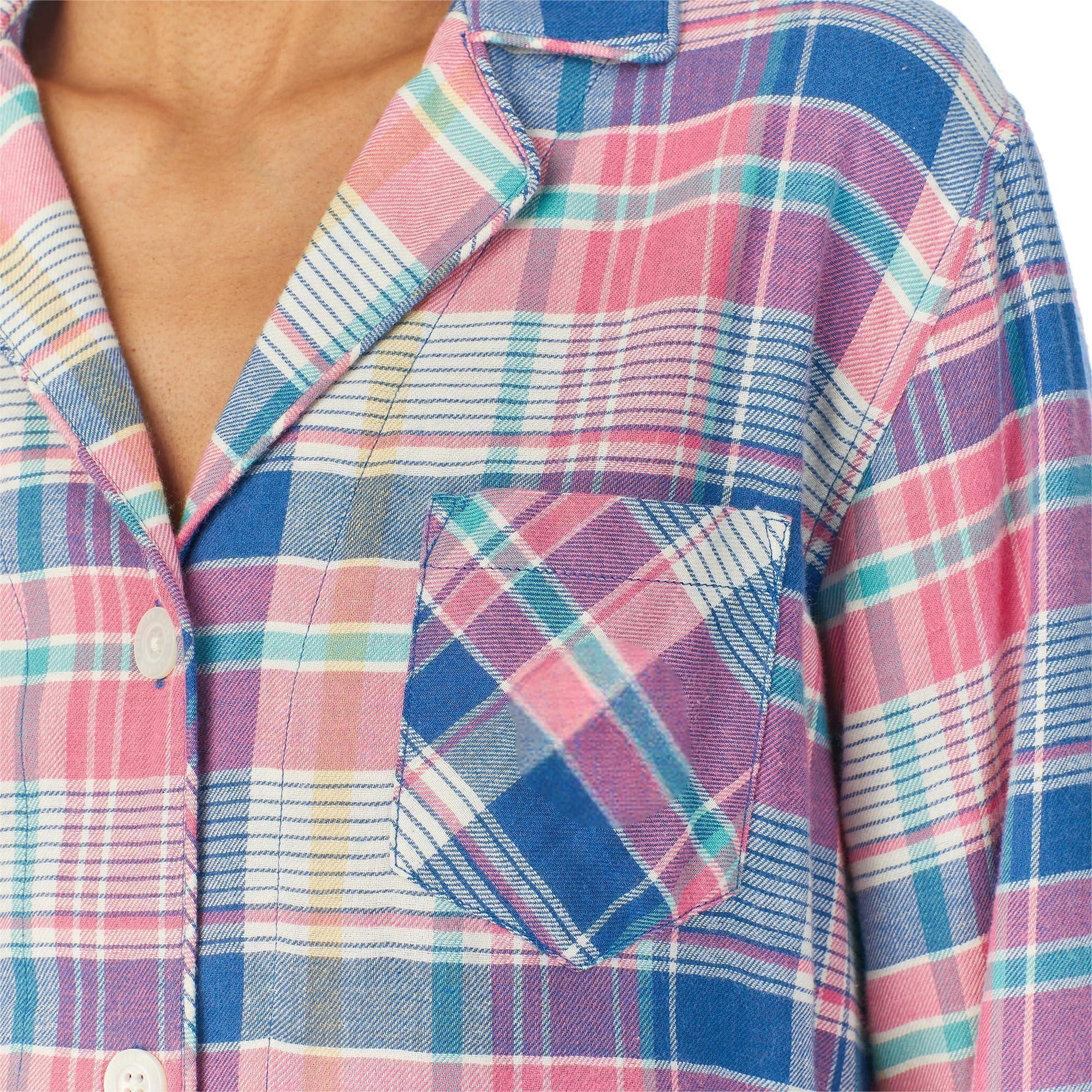 This pajama set features a cheerful plaid pattern in shades of blue, pink, and white, giving it a fresh and classic sleepwear look. The long sleeve top is designed with a notched collar, button-front closure, chest pocket, and relaxed silhouette for a timeless pajama-inspired finish that feels both polished and comfortable. The matching full-length pants complete the set with an easy straight-leg shape that allows relaxed movement for sleeping and lounging.