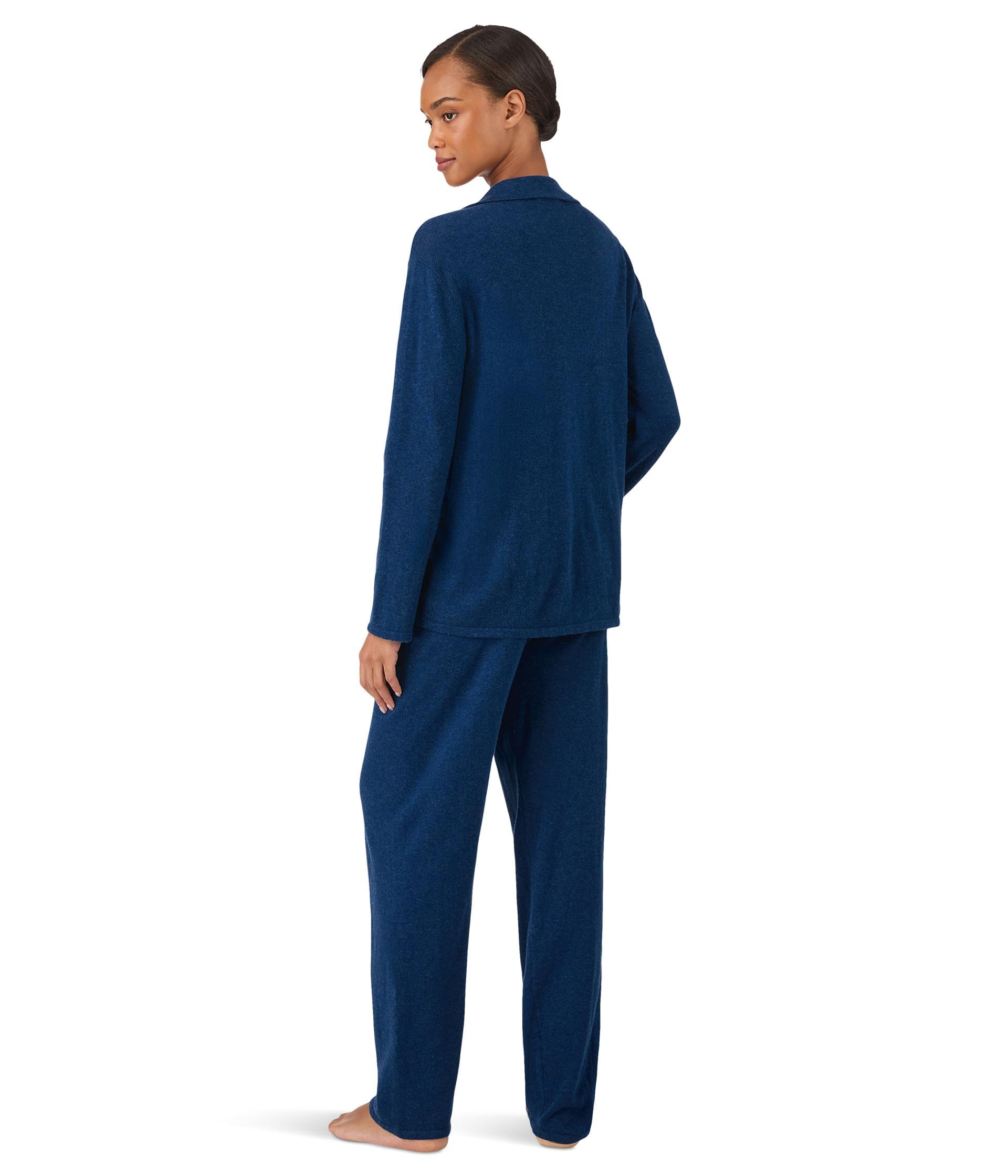 This pajama set features a rich navy blue color with a relaxed, understated look that feels both classic and refined. The long sleeve top is designed with a soft notched collar, button-front closure, and front patch pockets, giving it a timeless pajama-inspired style with an easy, comfortable fit. The matching full-length pants complete the set with a relaxed straight-leg silhouette that works well for sleeping, lounging, and quiet mornings at home.
