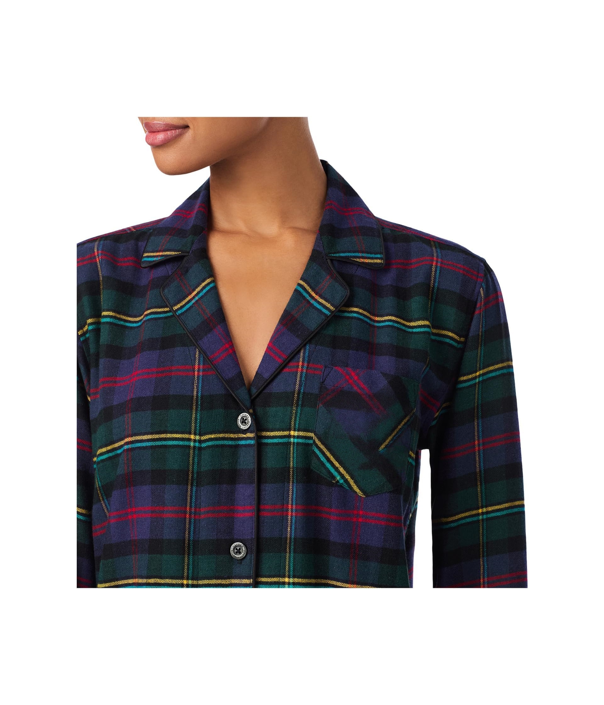 This pajama set features a rich navy base with a classic tartan plaid pattern in green, red, and yellow, giving it a timeless sleepwear look with a cozy, heritage-inspired feel. The long sleeve top is styled with a notched collar, button-front closure, chest embroidery, and a relaxed silhouette that feels polished yet comfortable for everyday wear. The matching full-length pants complete the set with an easy straight-leg shape for relaxed movement and all-night comfort.
